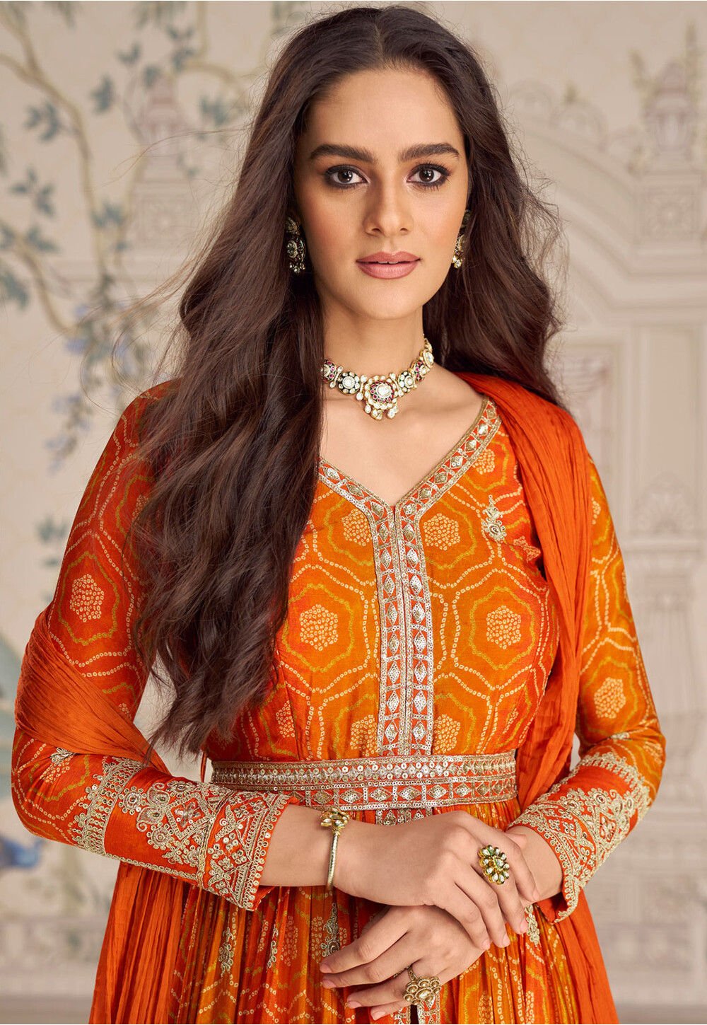 Bandhej Printed Faux Crepe Front Open Abaya Style Suit in Orange