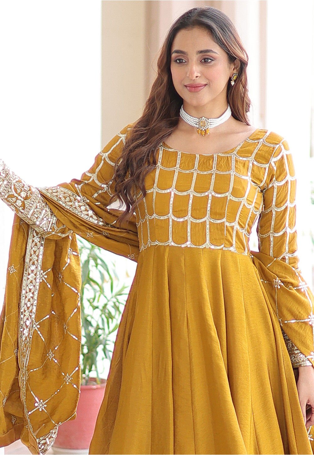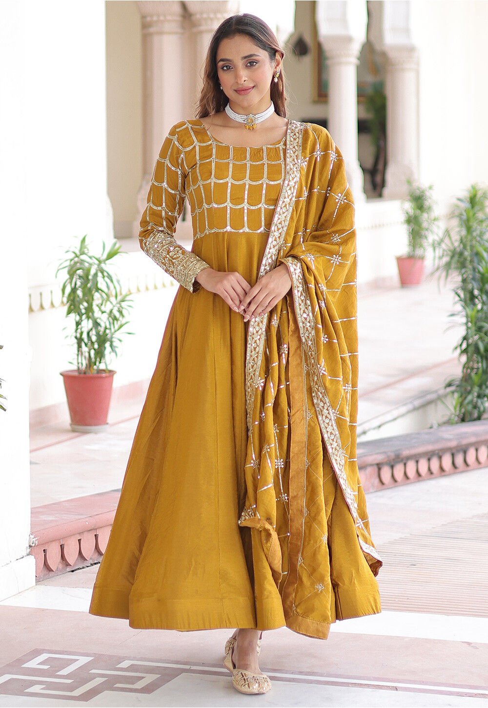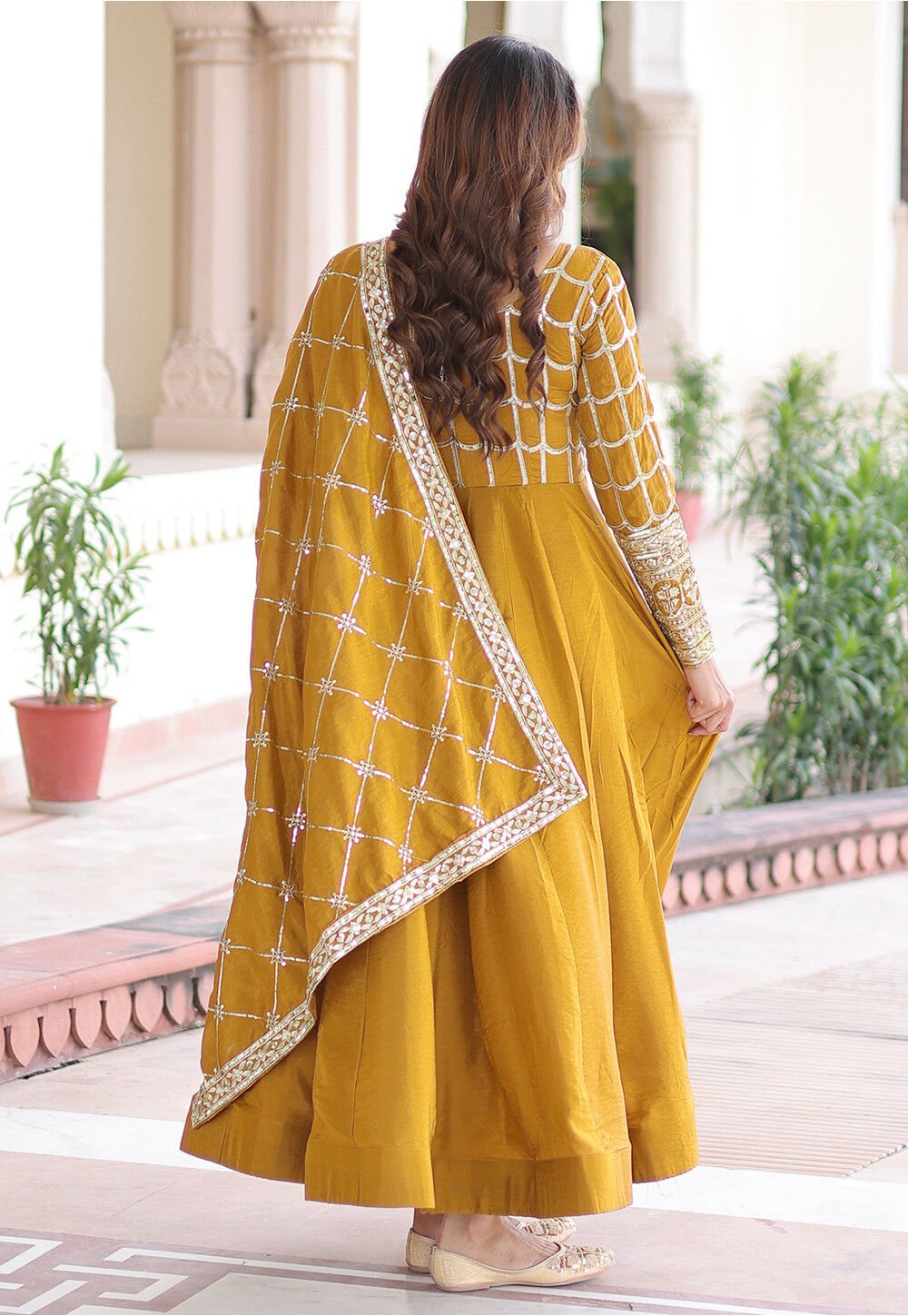 - Art Silk Anarkali Kameez in Mustard