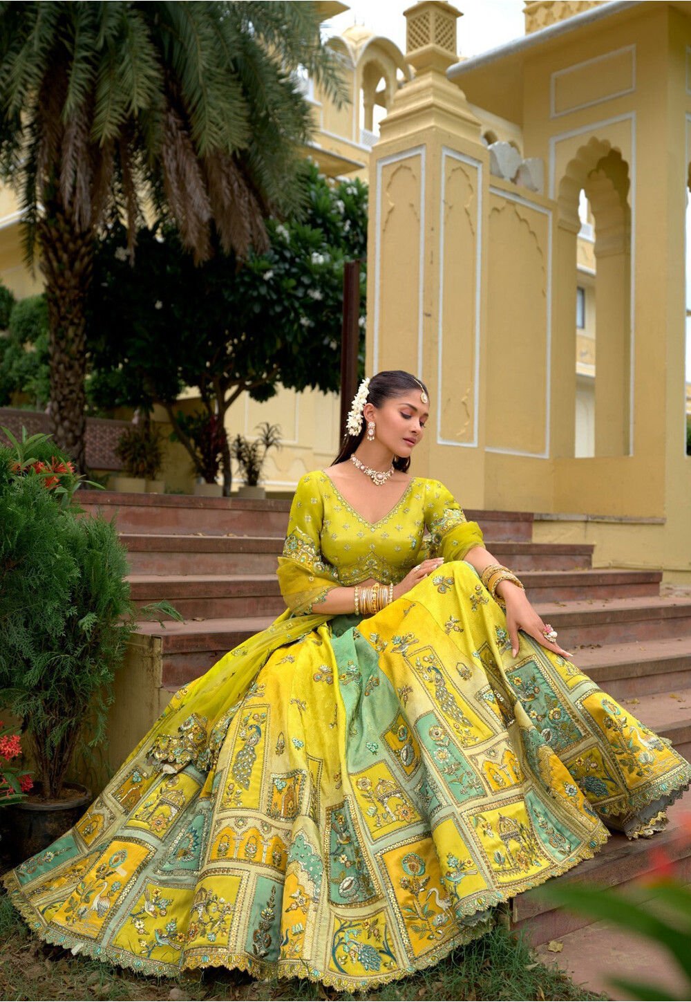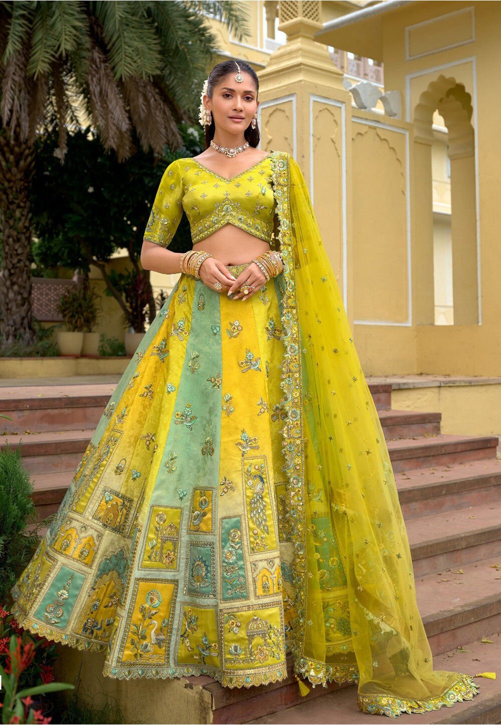 • Available with a Semi-Stitched V Neck and Half Sleeves Art Silk Choli and a Net Dupatta in Light Green.