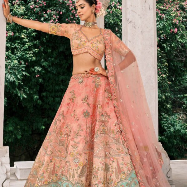 - This attire with Poly Shantoon lining is Enhanced with Resham, Zari, Dori, Sequins and Stone Work