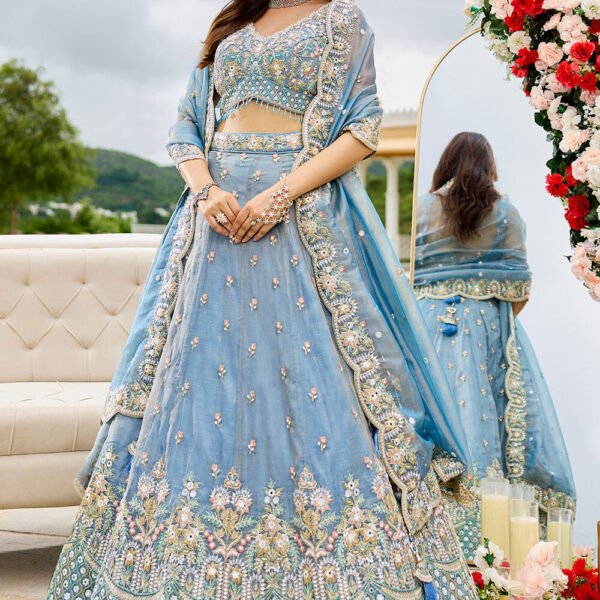 - This attire with Poly Shantoon lining is Enhanced with Dangles, Resham, Zari, Dori, Sequins and Stone Work