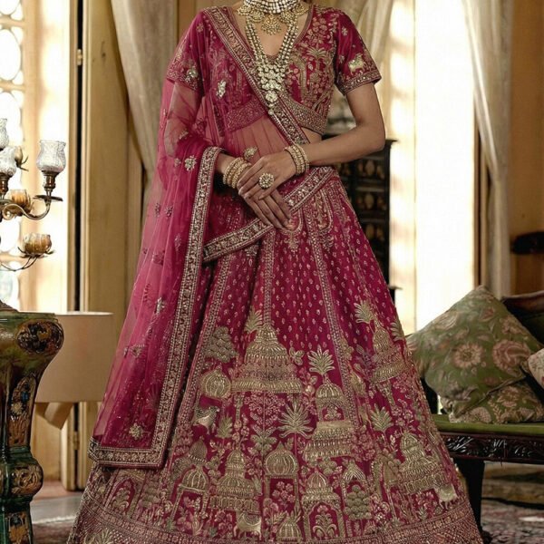 - This attire with Faux Crepe lining is Enhanced with Resham, Dori, Sequins and Stone Work