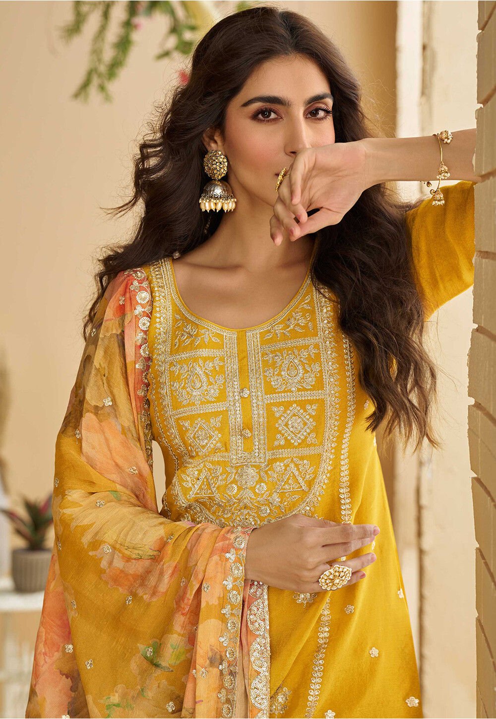 Embroidered Chinon Chiffon Pakistani Suit in Mustard