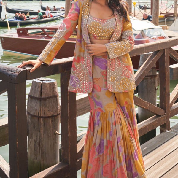 - Available with a Chinon Crepe Sharara in Grey and Blue and a Chinon Crepe Jacket in Grey and Blue