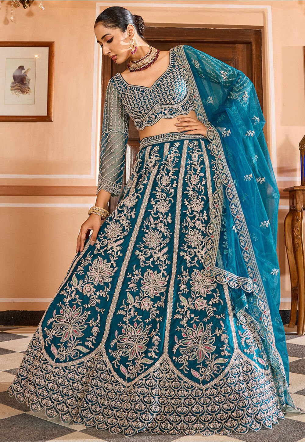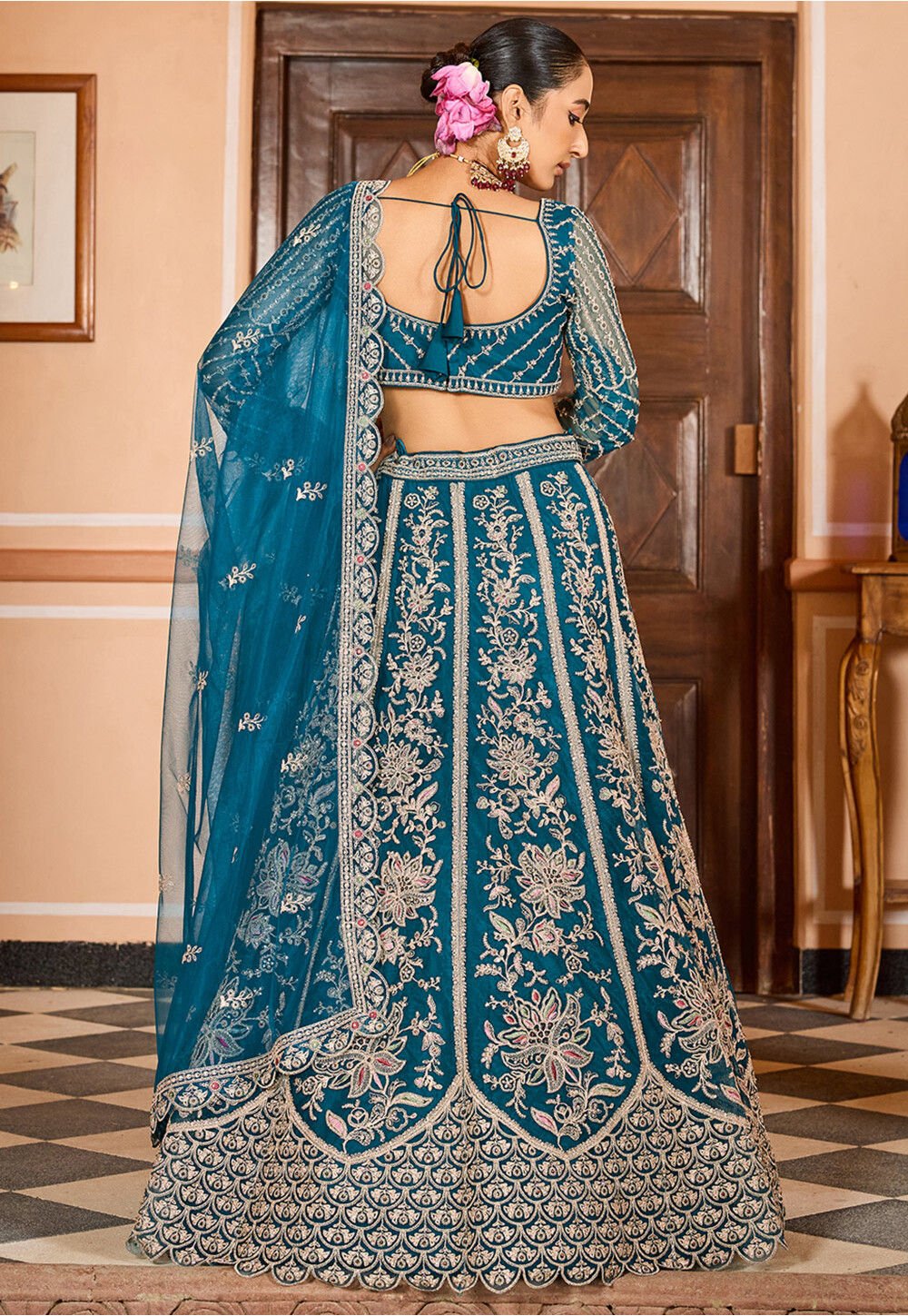 • Available with a Semi-Stitched Sweetheart Neck and Quarter Sleeve Net Choli and a Net Dupatta in Teal Blue
