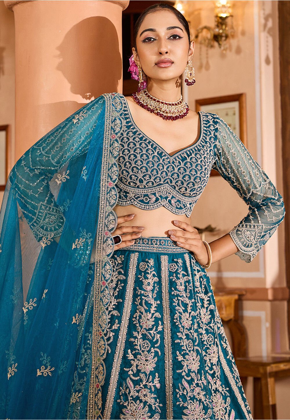 Be the first to review “Embroidered Net Lehenga in Teal Blue”