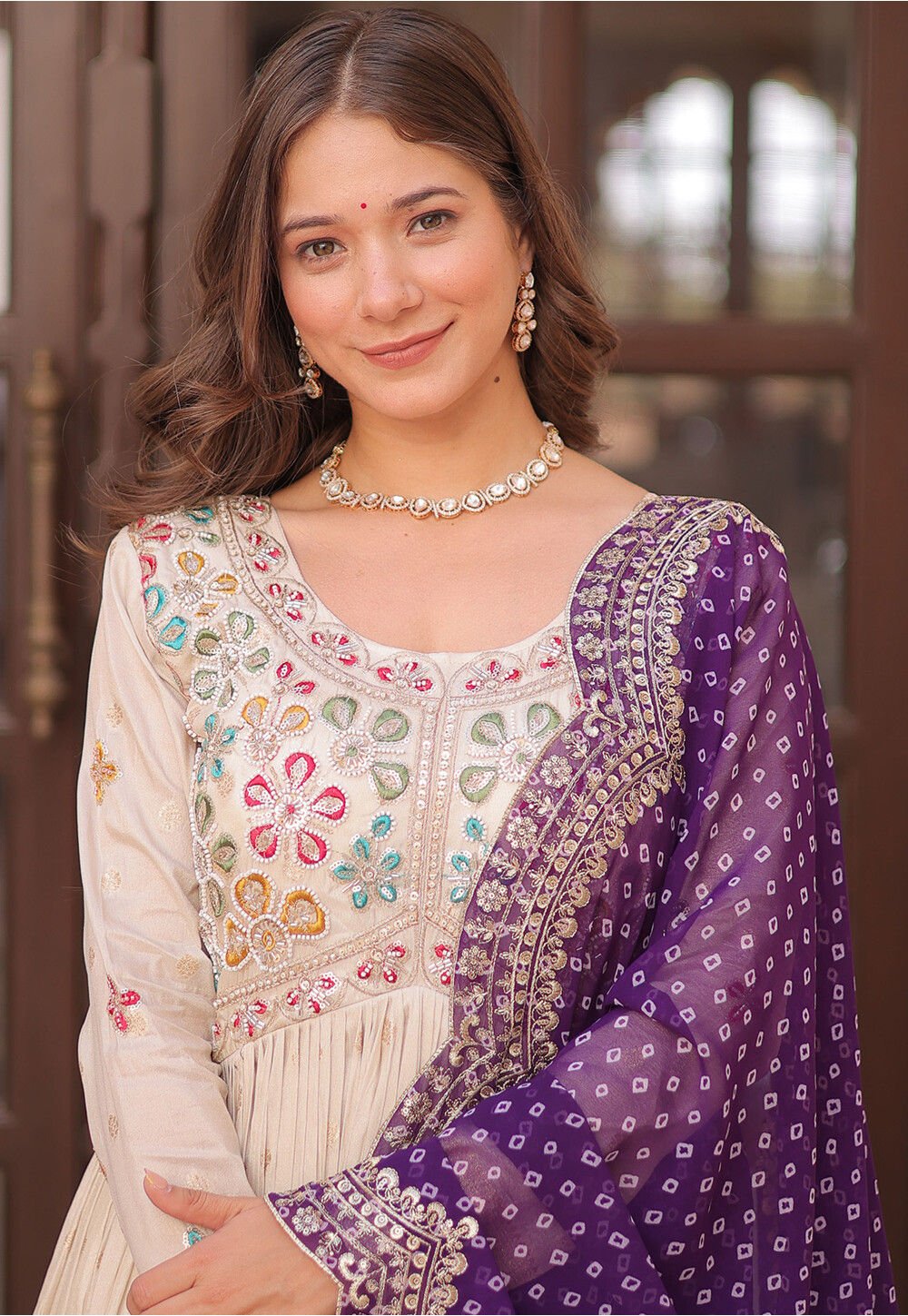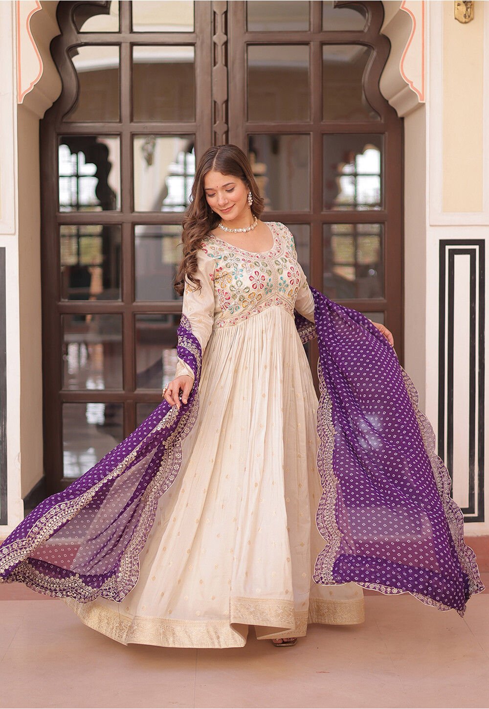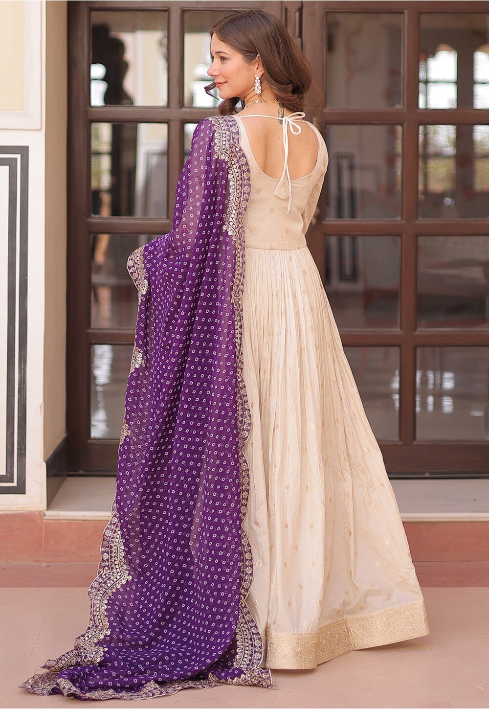 - Available with a Lycra(Elastane) Leggings and a Bandhej Printed Faux Georgette Dupatta in Purple