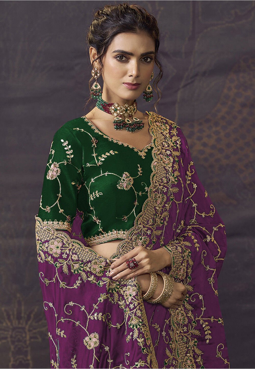 - Available with a Semi-stitched Sweetheart Neck and Half Sleeve Art Silk Blouse in Dark Green