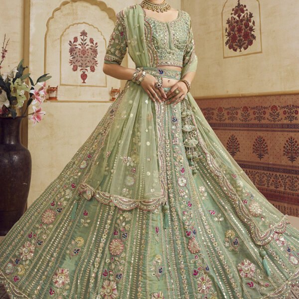 Green Net Designer Embroidered Lehenga Set Original price was: ₹17,500.00.Current price is: ₹15,750.00.