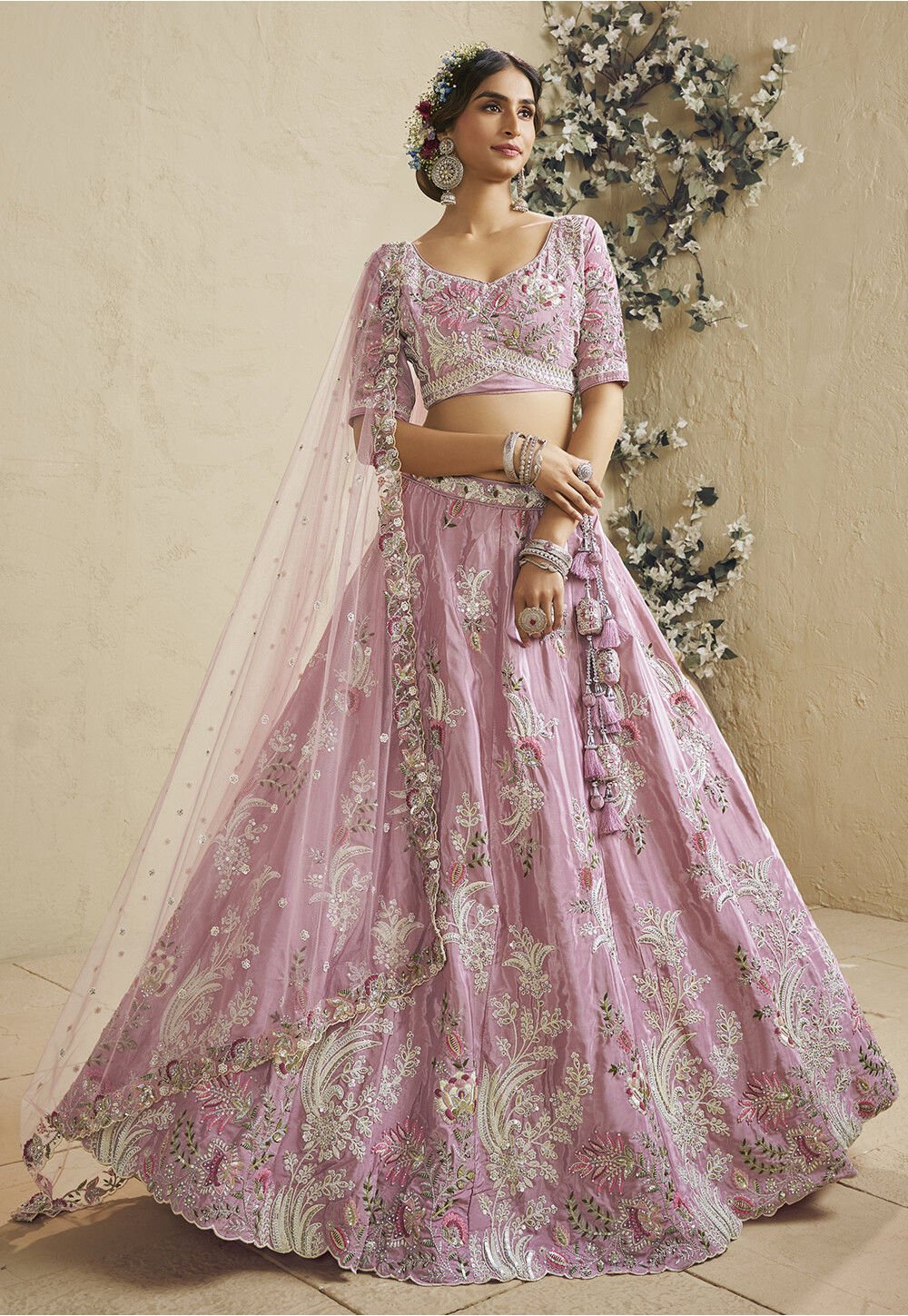 - Pink lehenga choli with dupatta.
