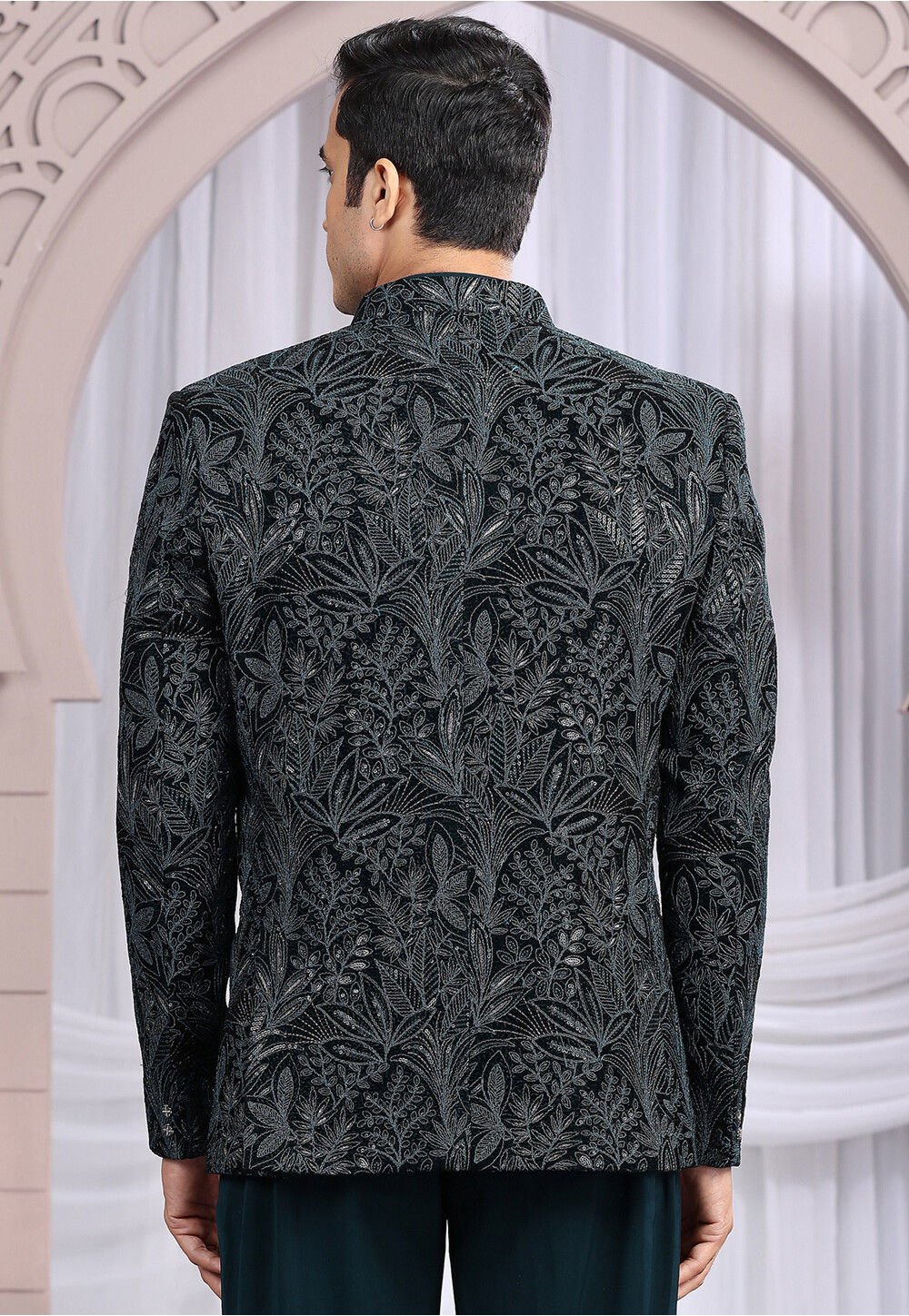 Embroidered Velvet Jodhpuri Jacket in Dark Teal Green