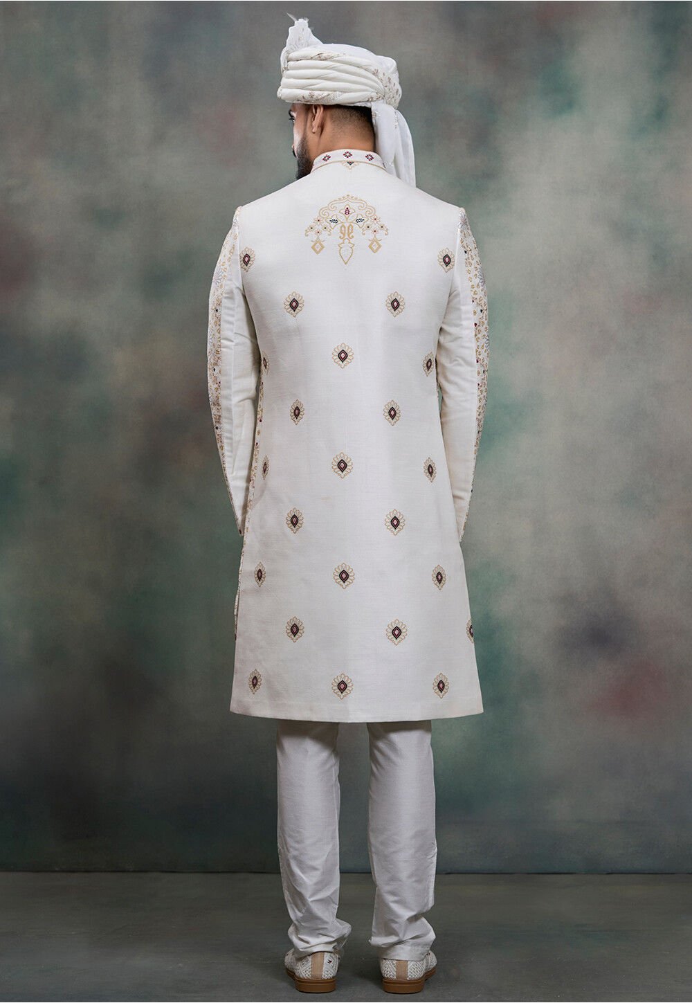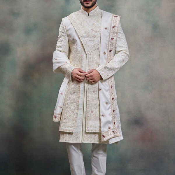 Hand Embroidered Art Silk Jacket Style Sherwani in White