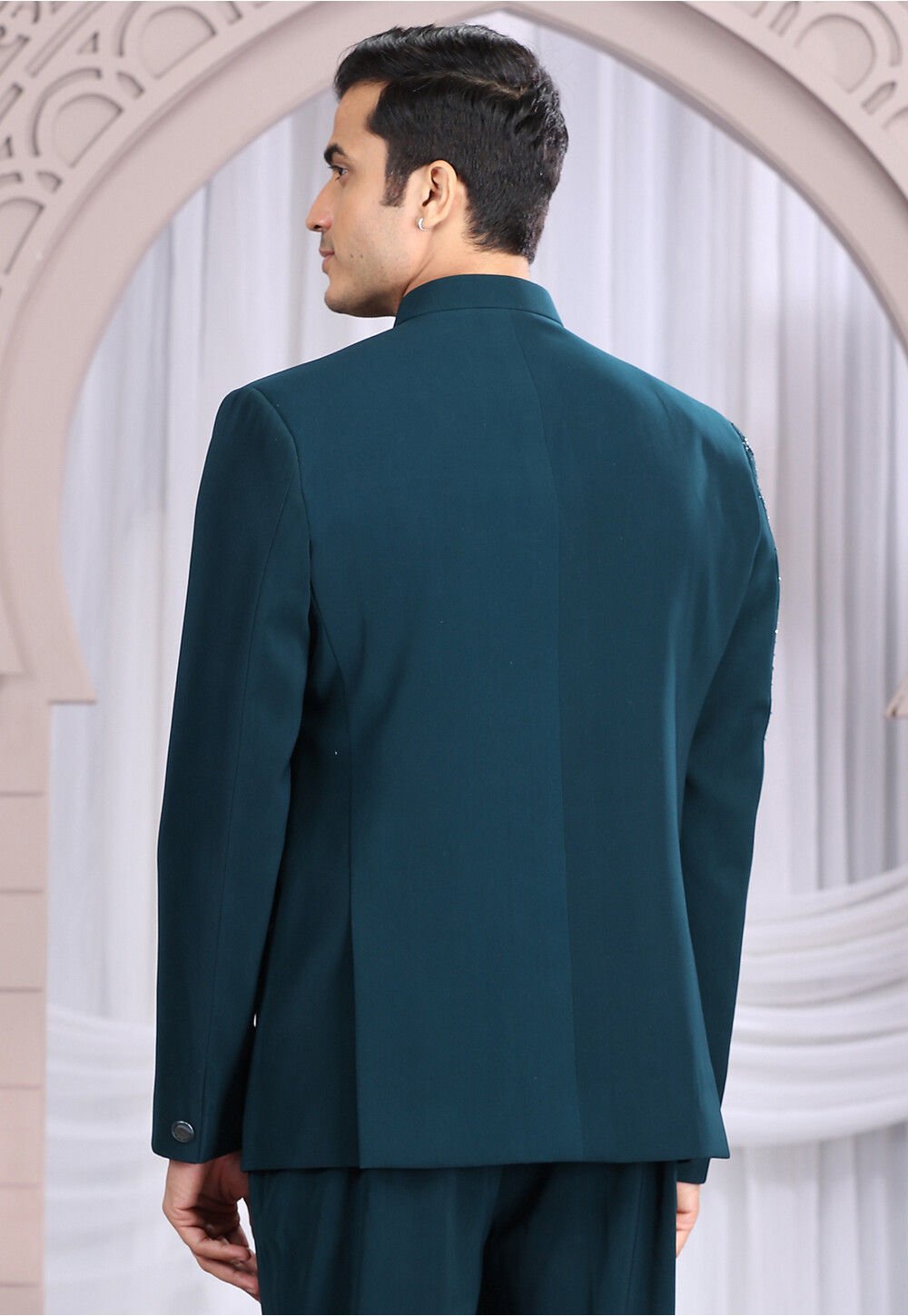 Hand Embroidered Art Silk Jodhpuri Jacket in Teal Green