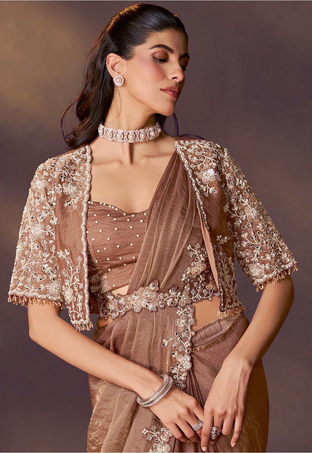 • Available with a Readymade Sweetheart Neck and Half Sleeves Art Satin Silk Blouse in Brown and an Art Silk Jacket in Brown