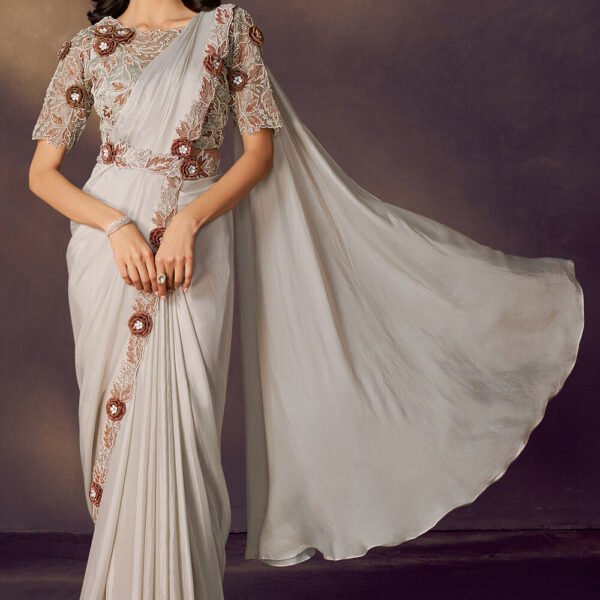 - Available with a Readymade Sweetheart Neck and Sleevesless Art Satin Silk Blouse in Light Beige and a Net Cape in Light Beige