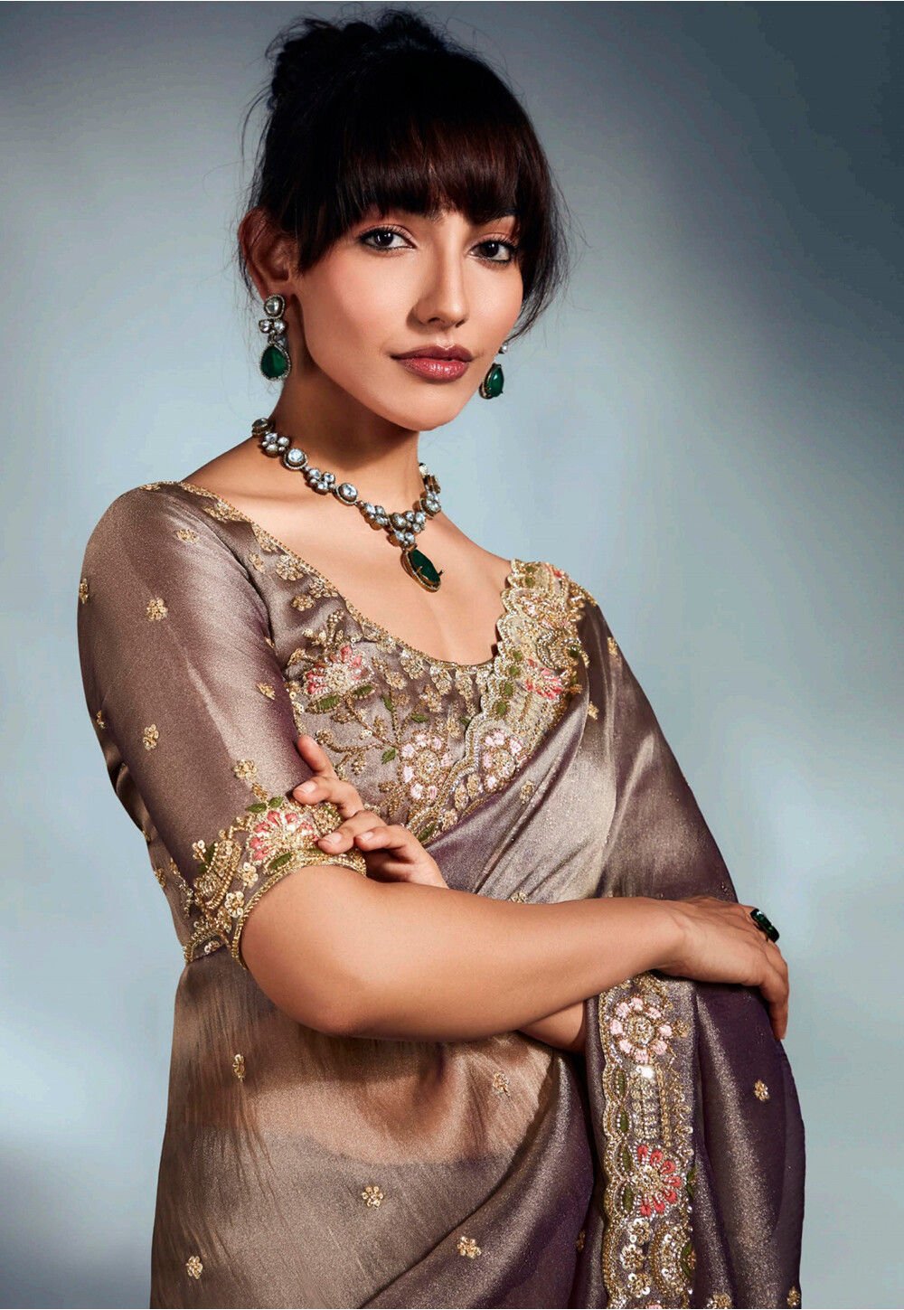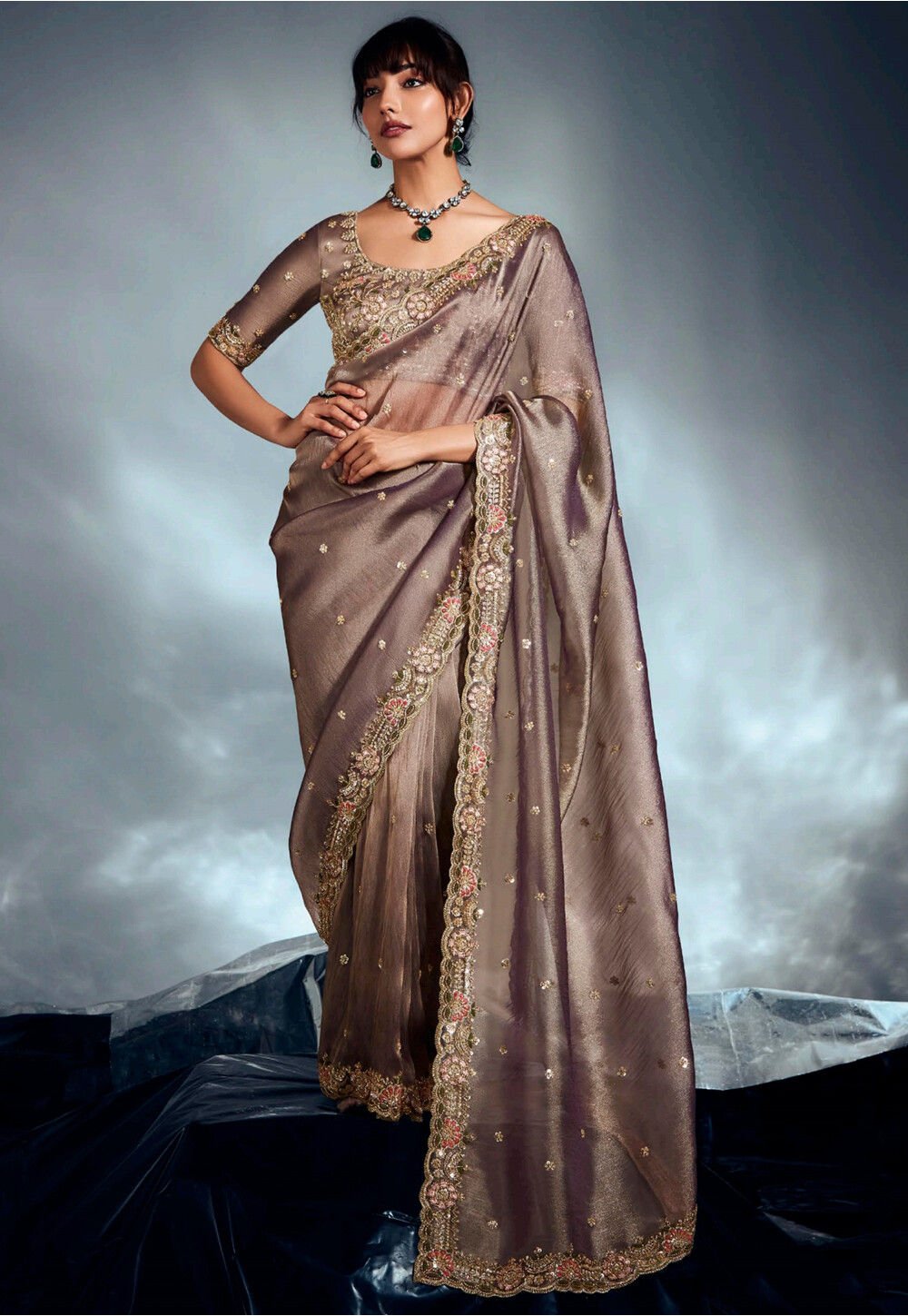 Be the first to review “Hand Embroidered Tissue Silk Saree in Grey”