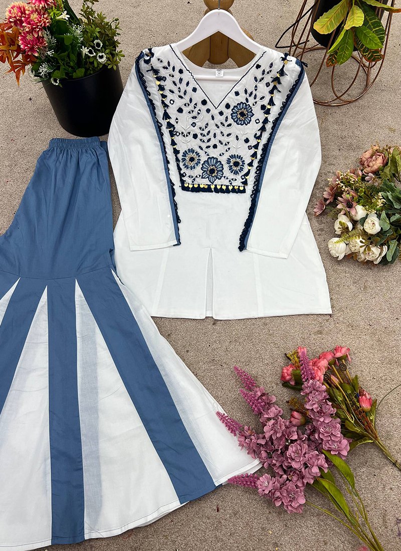 Silk Blue & White Casual Wear Embroidery Work Readymade Top With Sharara