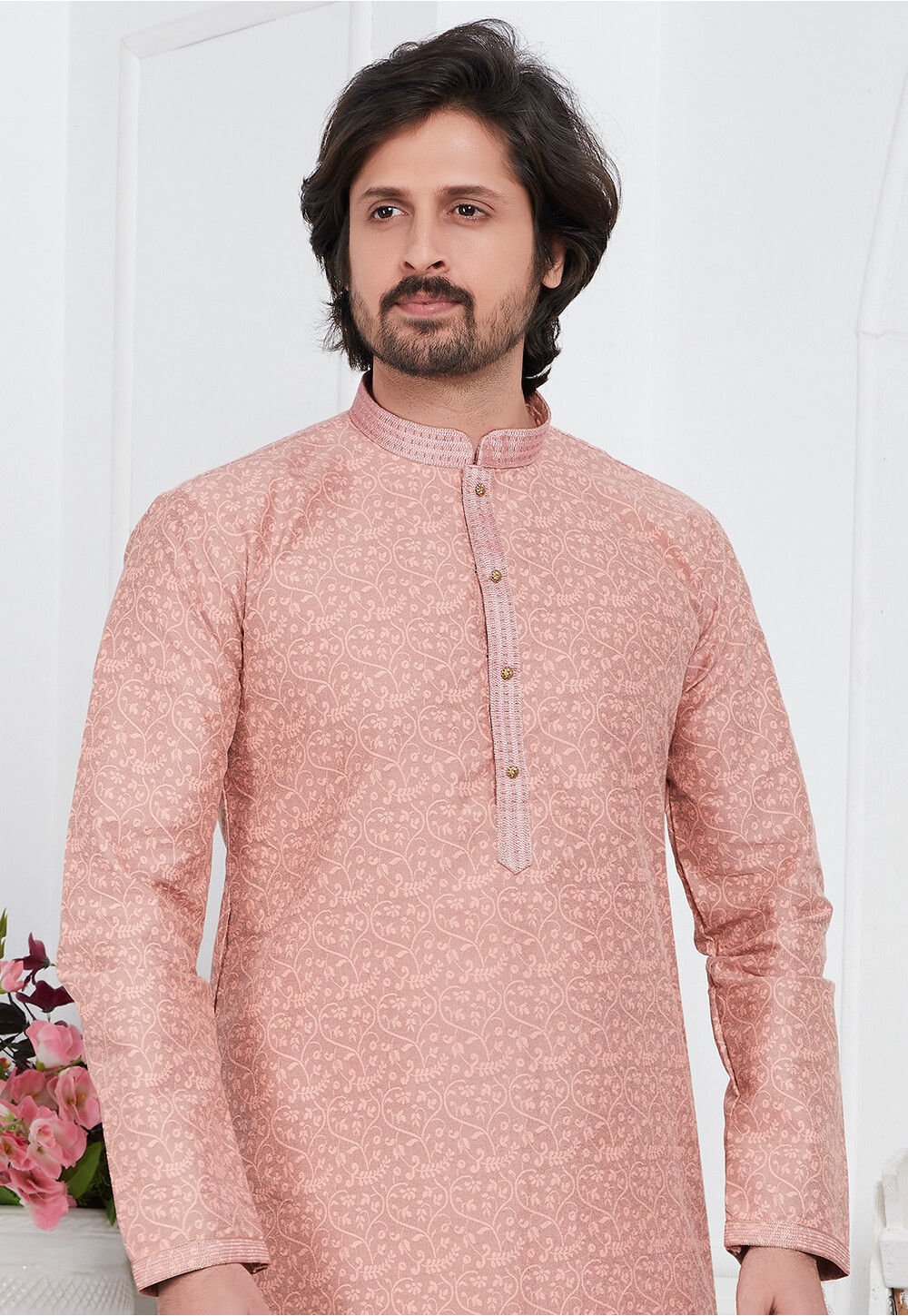 - This Readymade Chinese Collar Neck and Full Sleeve attire is Woven in Floral Motifs