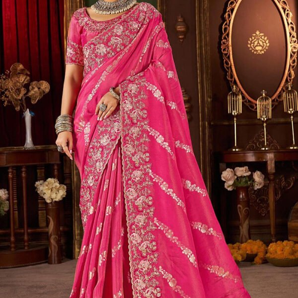 - Available with a Semi-stitched Round Neck and Short Sleeve Art Silk Blouse in Fuchsia