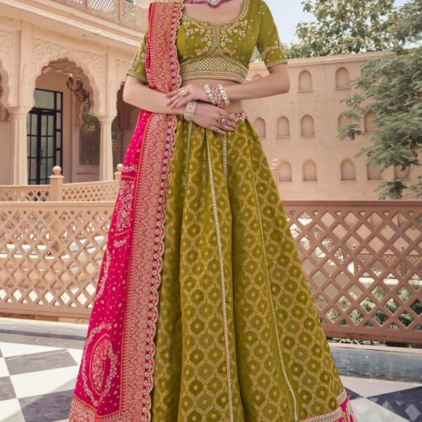 Woven Organza Jacquard Lehenga in Olive Green Original price was: ₹19,500.00.Current price is: ₹17,550.00.